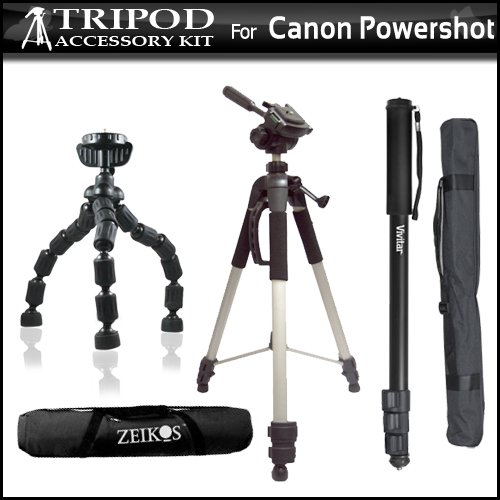 Tripod & Monopod Kit For Canon POWERSHOT G12 G7 G9 G10 G11 PRO1 A650 A640 S5 IS S3 IS S90 IS SX10 IS SX1 IS SX20 SX120 IS A570 A590 E1 Includes 57 Inch Tripod, 67 Inch Monopod & Gripster Flexible Mini tripod Overview